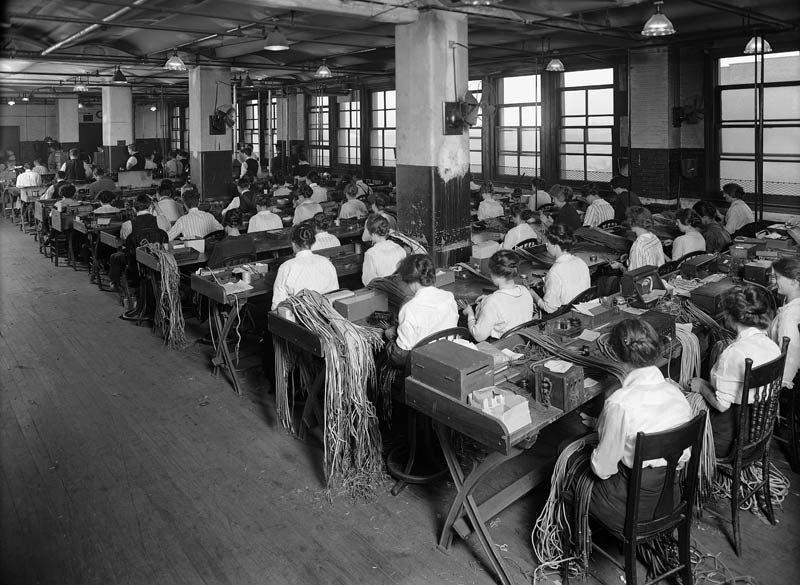 In a large factory, women at the Western Electric Company in New York City make wire attachments for telephones.