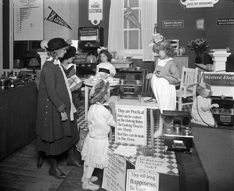 Promoting the use of electricity in the early twentieth century often relied on displaying gender roles deemed appropriate for girls and women at the time. Taken at an Electrical Exposition in New York City, this photo displays products of the Western Electric Company.
