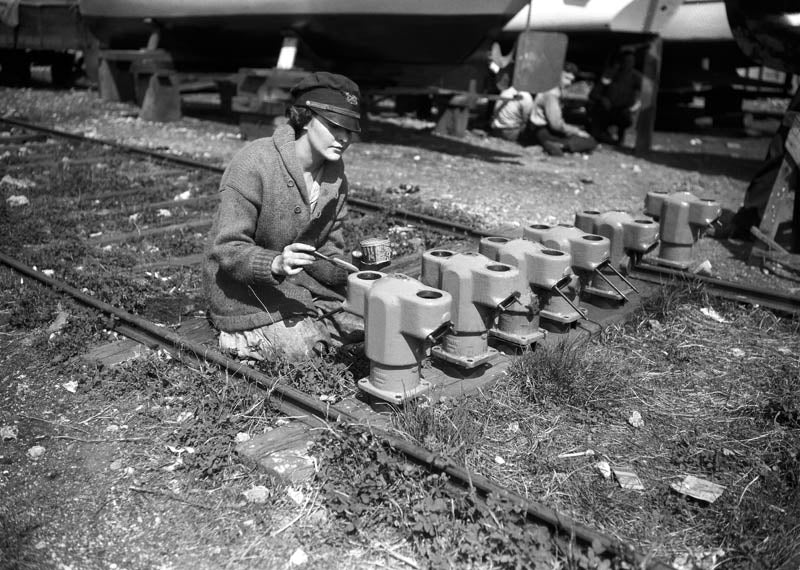 In an unidentified boatyard, a young woman sits on the ground between two rails of a marine railway, painting a row of six engine mounts.