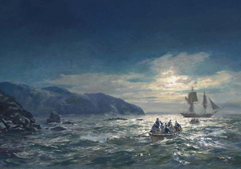 Anti-smuggling patrol on the Cornish coast, 1803... From the painting used for the cover of Julian Stockwin's eighth book in the Kydd series.