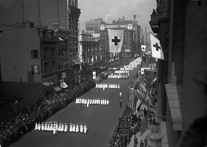 Broadway in New York City is the scene for a patriotic parade with American Red Cross women workers.