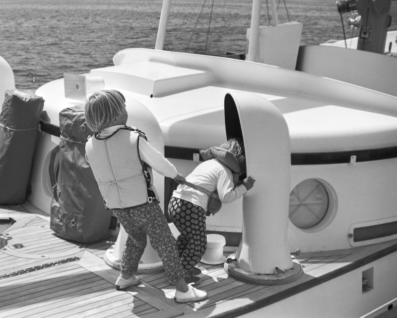 At the start of the Newport to Bermuda Race, these young girls are intrigued by the vent provided by a large dorade (ventilator) on a sailing yacht.