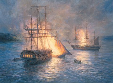 Fireships on the Hudson is one of 5 paintings in the American Revolutionary War series. In July 1776 the British sent a small squadron of warships into the Hudson River, the Pheonix, 44 guns, the Rose, 20 guns, and two small tenders. On the night of August 16, the ships were at anchor when two vessels were sighted nearby. Their crews were seen setting fires and abandoning ship — the American rebels were using fireships, the most feared form of attack against combustible wooden warships.