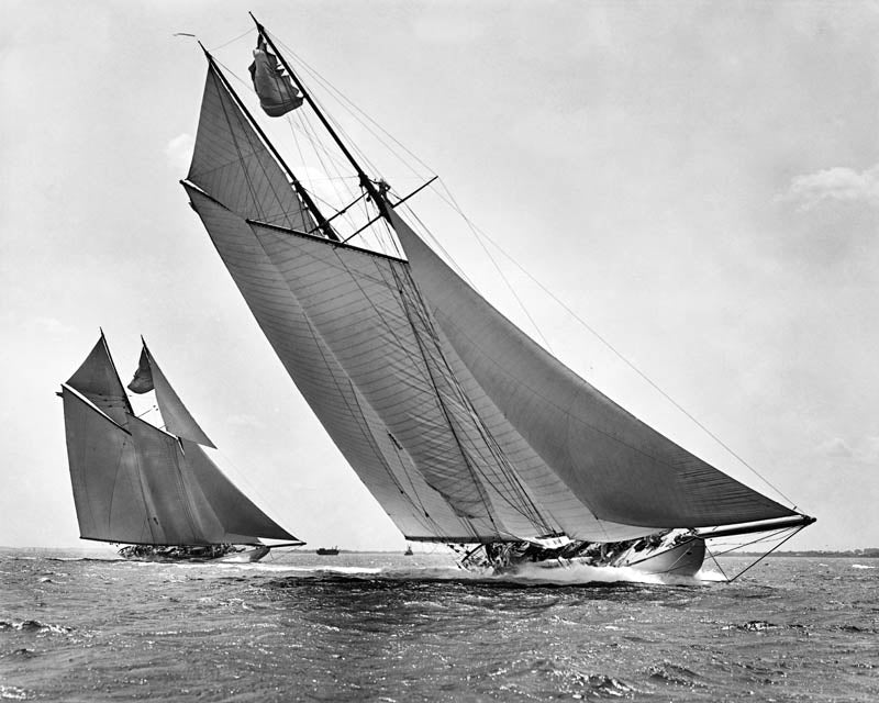 Photographed by James Burton on July 27, c. 1908. Image of the 127' Herreshoff schooner INGOMAR (built 1903 in Bristol, R.I.) and the 125' Smith-designed and Lawley-built schooner ELMINA (built 1905 in Neponset, MA) racing the first round.
