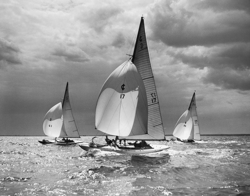 International One Design sloops SPELLBOUND, GRILSE, and AILEEN on Long Island Sound. Photographed by Rosenfeld and Sons on May 28, 1949.
