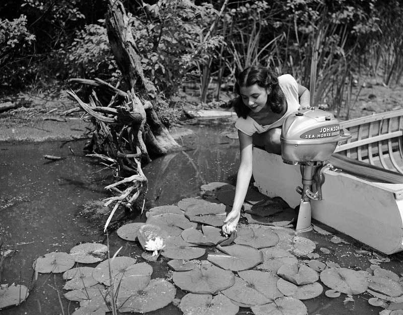 This serene image is an advertisement for the "Sea Horse" outboard motor.