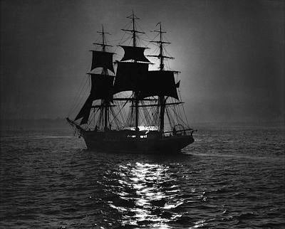 Auxiliary training ship JOSEPH CONRAD (built 1882 in Copenhagen, Denmark) sailing out of New York Harbor with a crew of very young sailors aboard on a training cruise. Photographed by Rosenfeld and Sons on January 31, 1935.