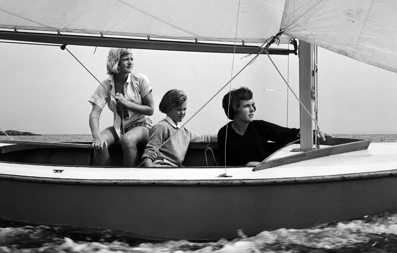 During the juniors races at the American Yacht Club in Rye, New York, these three girls race in a Blue Jay class sloop.