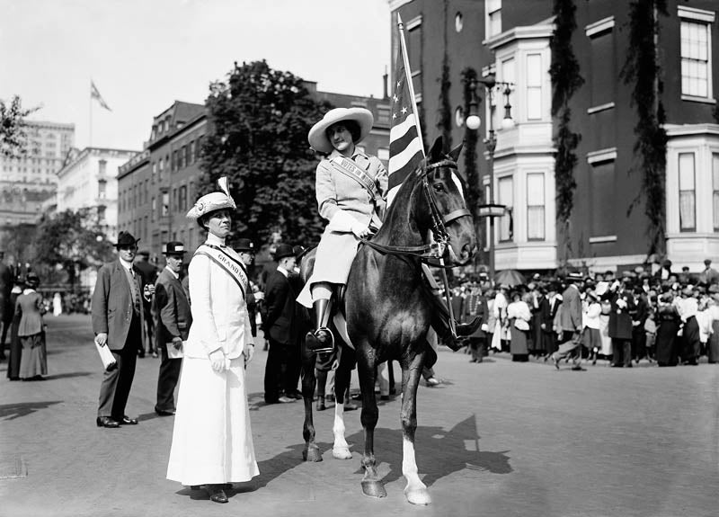 Two women suffragists, Josephine Beiderhase (standing) and Inez Milholland (on horseback) wear the characteristic white banners promoting “Votes for Women.” Inez Milholland (later Boussevain) attended Vassar College, where she was suspended for organizing a woman’s suffrage meeting. Suffering from anemia, she died young (at age 30) after collapsing during a speech in Los Angeles. Beiderhase was a physical education teacher and advocate in New York.