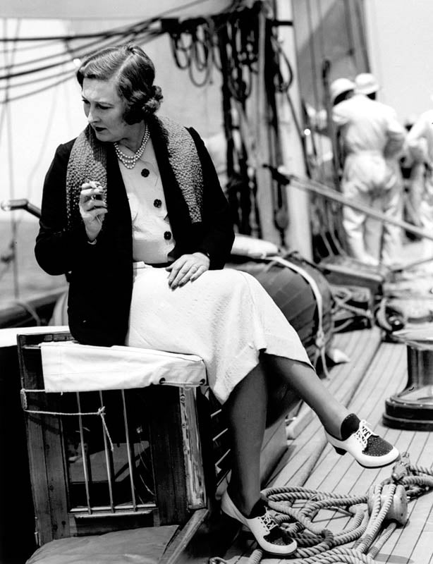 Phyllis Sopwith was the second wife of Sir Thomas Octave Murdock Sopwith, the owner and skipper of America’s Cup challengers Endeavour (1934) and Endeavour II (1937). She was at his side on deck as timekeeper, reporting minutes until the start and timing maneuvers and sail changes. She received a great deal of press attention for her contributions and her jaunty dress. Although not the only woman to sail in the America’s cup, she was certainly among the most memorable and set an example for future women sailors.