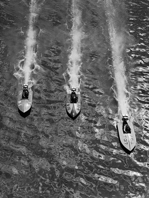 Photographed by Rosenfeld and Sons in September 1938 at the time of the Eastern Outboard Championships in Philadelphia, Pennsylvania. Image is an overhead view of three small hydroplanes is a spectacular combination of speed and reflected light.