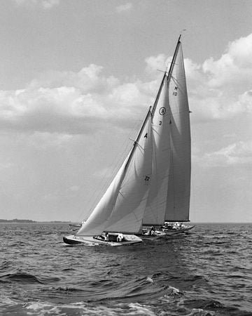 Image of NOWETA, International One Design ALALA, and ISTALENA, undersail in a line-up from left to right showing a port bow view. Photographed by Rosenfeld and Sons on July 16, 1934.