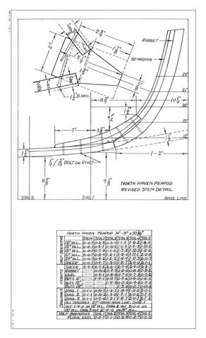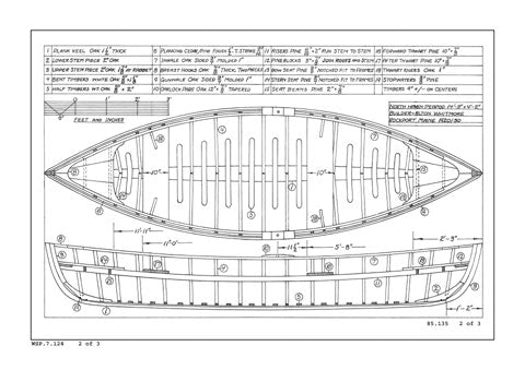 Alton Whitmore built this boat at North Haven, Maine, about 1929 for a local fisherman. John Gardner bought her in 1966 and in 1985, after he and Bill Mills built a copy; John gave her to Mystic Seaport. His chapter in Classic Small Craft You Can Build describes the Whitmore building process, commonly used for both peapods and small transom-stern tenders on the Maine coast. It is like the old Whitehall method, where the sheer strake, the binder, and the interior structure go in the boat before she is planked. Like most lobstering peapods, she has a heavy oak plank keel that needs to be steam-bent to take the required amount of rocker. Her layout is set up for fishing: she’d be bow-down without a load, stern-down when you reversed direction for standing up and push-rowing to work lightly among the rocks. She has an inch or so less sheer and a bit flatter deadrise than the peapod John Gardner modeled. From 87 Boat Designs by Ben Fuller.