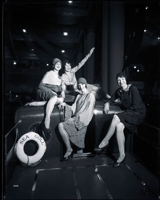 Draped on the cabin of a 39-foot Robinson cruiser motor yacht at a New York boat show, these young models were identified as (left to right): Sandy Burke, Helen Koster, Peggy O'Berg, and Dotty Koster.