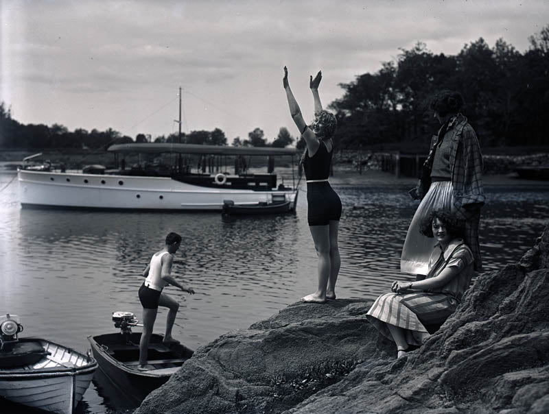 An advertisement for Johnson outboard engines, this photograph shows a beach party at low-tide on a June day in 1924.