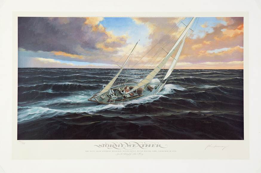 The setting evokes the experience of an offshore passage for anyone who has spent time at sea—or only dreamed of it. Stormy Weather was designed by Olin Stephens with long distance ocean racing in mind. She was built at the Nevens' Yard at City Island, New York, launched in 1934 and, having cruised countless miles and won many races, is still sailing—a fitting tribute to her designer and owners.
