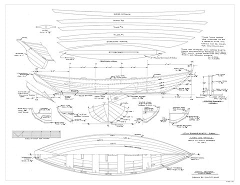 John Gardner modeled this boat, and Rob Pittaway drew up the results as John built her with Barry Thomas in the Mystic Seaport boat shop in 1974. His plans give you the general plank shapes, call for thole pins for rowing, and include a false bottom to protect the planks when grounding. Three rowing positions let you balance the boat's trim. The sloop rig drawn by Rob is completely traditional, with no blocks or cleats to ease sail handling. From 87 Boat Designs by Ben Fuller.
