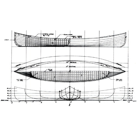 Henry Rushton of Canton, New York, responded to the small Rob Roy canoes with a series of double-paddle canoes. Most useful of these were the Vaux models, named for an American Canoe Association founder and author, C. Bowyer Vaux. Its lightweight makes it portable and an easy paddler. The length and breadth is so well proportioned that they keep exceptionally dry in rough water. The boat is perfectly double-ended. A relatively hard-bilged, shallow V bottom should give some stability in this light boat. From 87 Boat Designs by Ben Fuller.