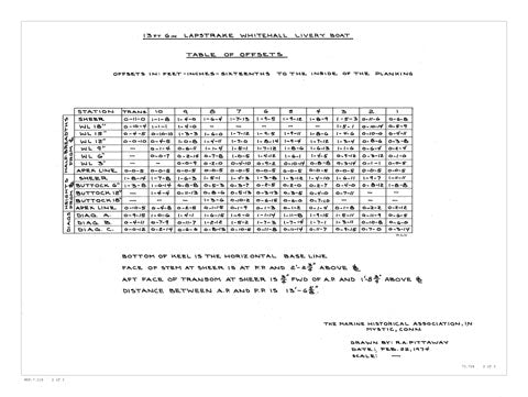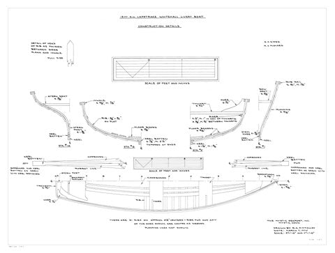 This lapstrake Whitehall-style pulling boat demonstrates several short cuts that made her quick to build, including her garboard, keel, keel-batten construction, and her full-width, bent flat frames. With the demands from boat liveries and from yachtsmen needing tenders, boat builders developed these faster ways to build around 1900. However, construction shortcuts are not evidenced in the elegant shape of this boat. She is narrower and much lighter (135 pounds) than the slightly shorter Boston Whitehall on the next page. She has a nice, highly tucked transom and a bit of rake in the stem. Like most of these shorter boats, she is set to pull with one, who could carry one or two passengers. From 87 Boat Designs by Ben Fuller. Plans drawn in 1974.