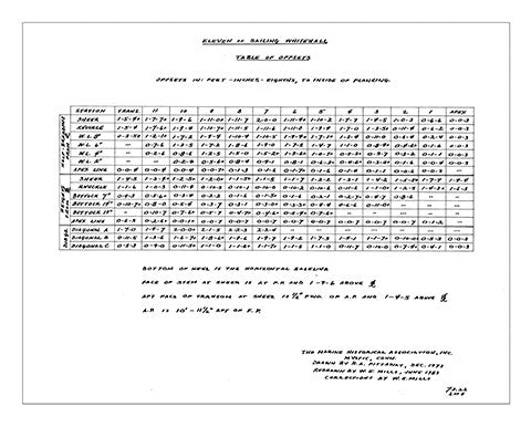 When this boat came to Mystic Seaport she was a relic without deck or thwarts, although you could see where they went. Evidence for shallow seats and notches forward indicate that she may have had side decks and a foredeck to make up for her low freeboard. Her shape and construction put her in the Whitehall class. Rob Pittaway drew her up, as is, just after she arrived at the Museum, and he also drew a proposed sailing rig and deck reconstruction. Bill Mills relofted the plans about l0 years later. From 87 Boat Designs by Ben Fuller. Plans drawn by Mystic Seaport staff in 1983.