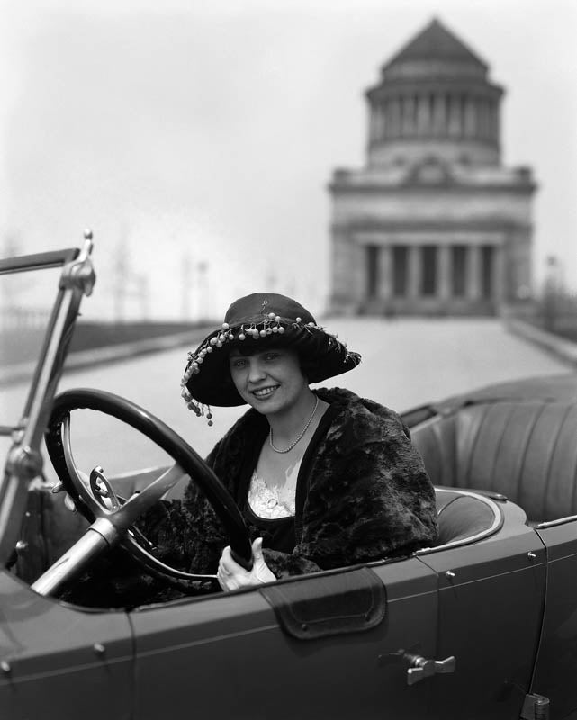 With a view of Grant's Tomb (in Manhattan) in the background, this actress shows off the new Roamer car, originally built in Streator, Illinois. The Roamer was considered a highly luxurious automobile.
