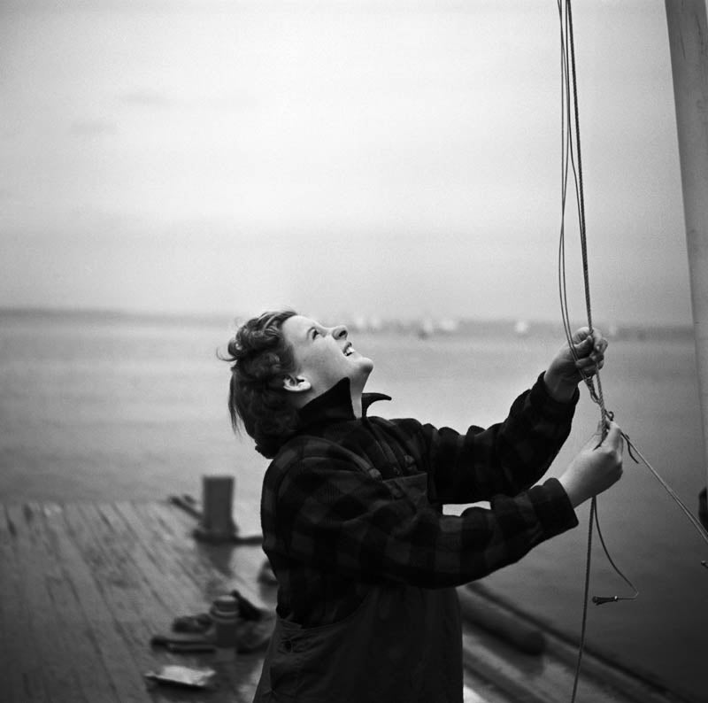 Eyeing something in the rigging, this woman works at fixing the problem. The image was photographed at the Frosbite Regatta at Larchmont Yacht Club on January 10, 1954.